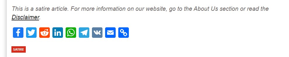 We skimmed through the article and found an endnote stating, “This is a satire article. For more information on our website, go to the About Us section or read the Disclaimer.”