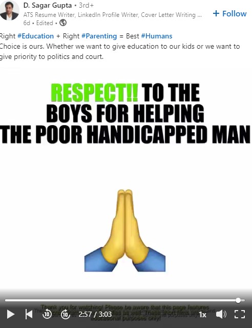 To verify the authenticity of the video, Newschecker conducted Google reverse image search by using keyframes of the clip and found a longer version of the video was posted on LinkedIn by user D. Sagar Gupta. In the end of the video we found a disclaimer saying that the video is only of “educational and entertainment” purpose.