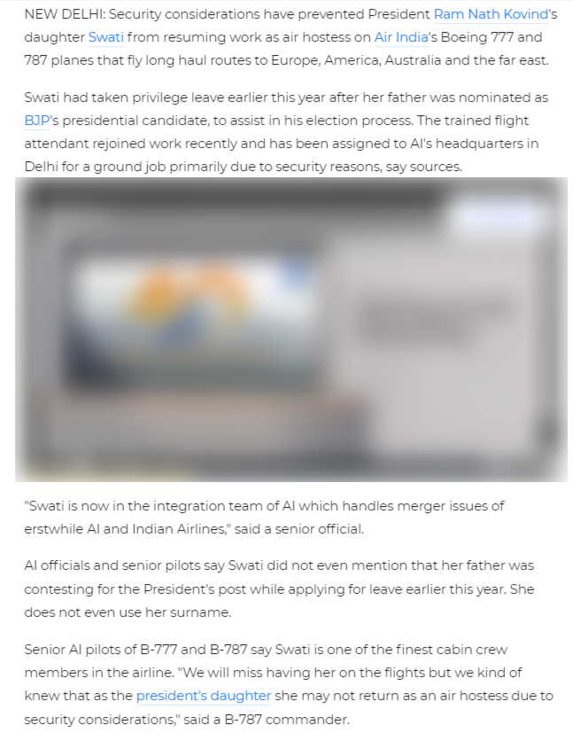 Upon performing a keyword search, Newschecker found that after Ram Nath Kovind became President, his daughter Swati Kovind was deployed in Air India’s integration team in 2017 for security reasons. .