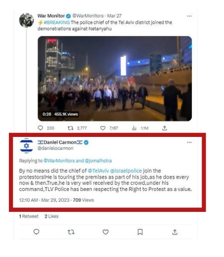 Following this, we scanned through the comment sections of social media posts carrying the viral footage, and found a reply by Daniel Carmon, former Ambassador of Israel to India, asserting that the Police Chief has “by no means” joined the protest. Adding, “He is touring the premises as part of his job,as he does every now & then. True, he is very well received by the crowd,under his command,TLV Police has been respecting the Right to Protest as a value.”
