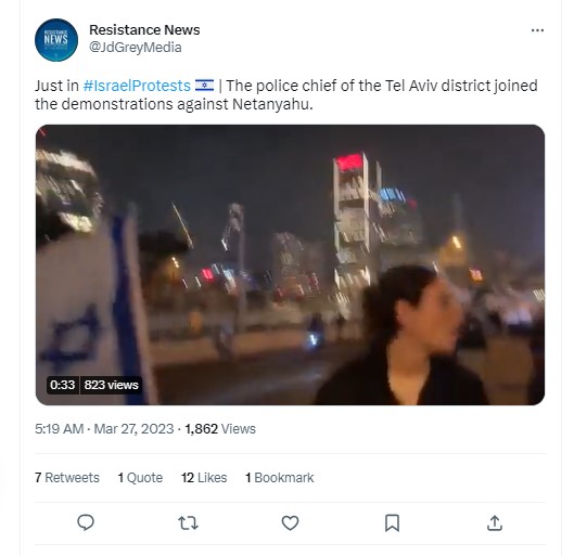 Several Twitter and Facebook users shared the video claiming, “The police chief of the Tel Aviv district joined the demonstrations against Netanyahu.”