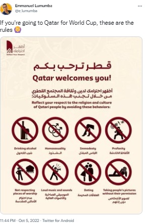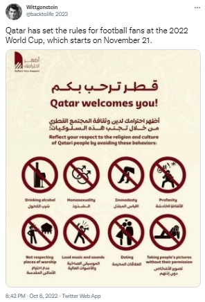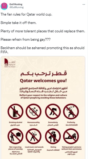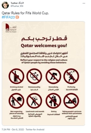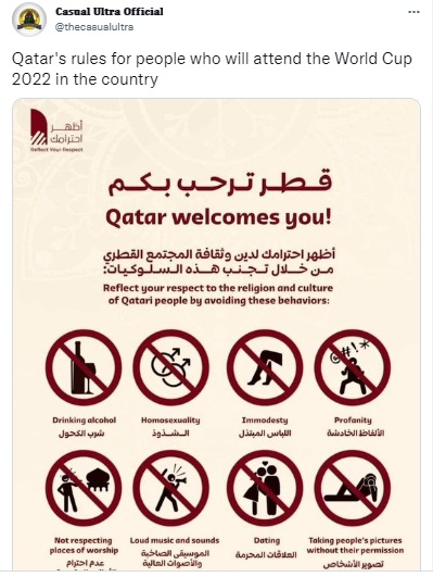 In addition to drinking and playing loud music, the infographic also advises fans to desists from immodesty, profanity, disrespecting places of worship and homosexuality. The infographic has attracted a lot of criticism for the World Cup, which has been mired in controversy ever since the hosting rights were granted to Qatar in 2010, the first time the FIFA tournament has been held in a Middle East country. Highlighting the allegations of bribery to the violation of human rights, there have been widespread calls for boycotting the tournament.