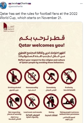 An infographic purportedly issued by the organising committee of the 2022 FIFA World Cup in Qatar advising fans to “respect the religion and culture of Qatari people” by refraining from drinking alcohol, playing loud music and sounds, among other things, has taken the internet by storm. Several users have shared the infographic claiming it to be the rules Qatar has set for football fans, ahead of the 2022 FIFA World Cup that starts on November 20.