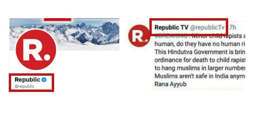 An alleged tweet by Republic TV quoting journalist Rana Ayyub saying, “Minor child rapists are also human, do they have no human rights? This Hindutva Government is bringing ordinance for death to child rapists just to hang Muslims in large numbers. Muslims aren’t safe in India anymore.”