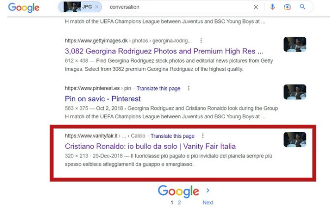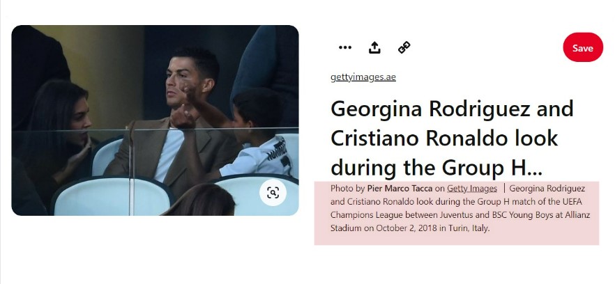 The search also yielded a Pinterest post displaying the viral photograph with the description, “Georgina Rodriguez and Cristiano Ronaldo look during the Group H match of the UEFA Champions League between Juventus and BSC Young Boys at Allianz Stadium on October 2, 2018 in Turin, Italy.”