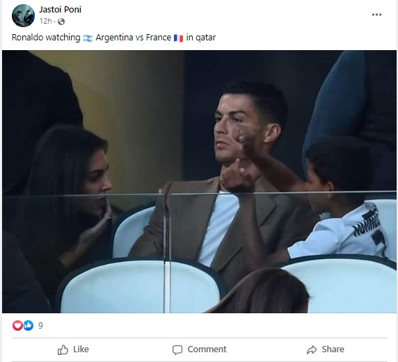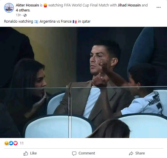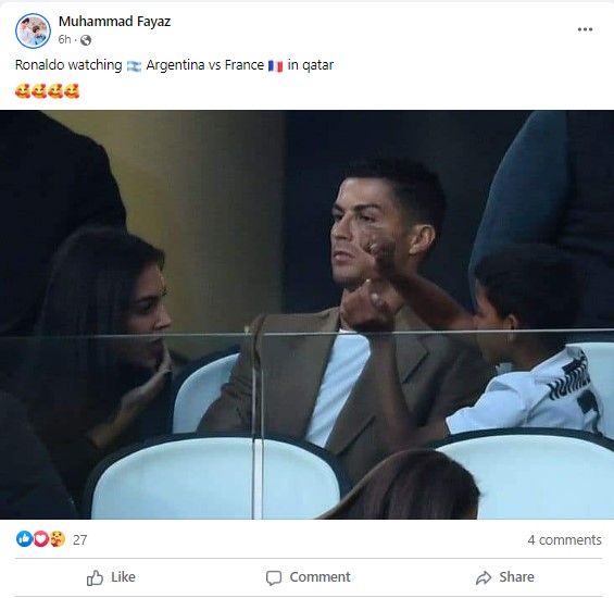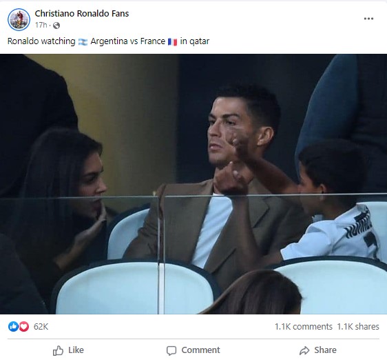 Several Facebook users shared the viral photograph with the caption, “Ronaldo watching Argentina vs France in Qatar.”