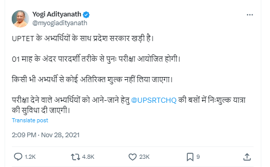 Multiple reports from November 2021 stated that the UP government had cancelled the TET (Teacher Eligibility Test) examination after the police found that the question paper had been leaked. Adding, that CM Yogi had ordered reconvening of the exam within a month. Such reports can be seen here, here and here.