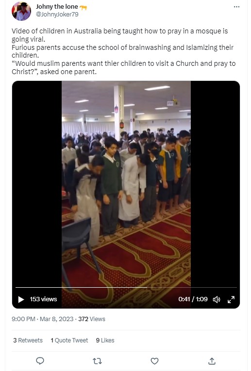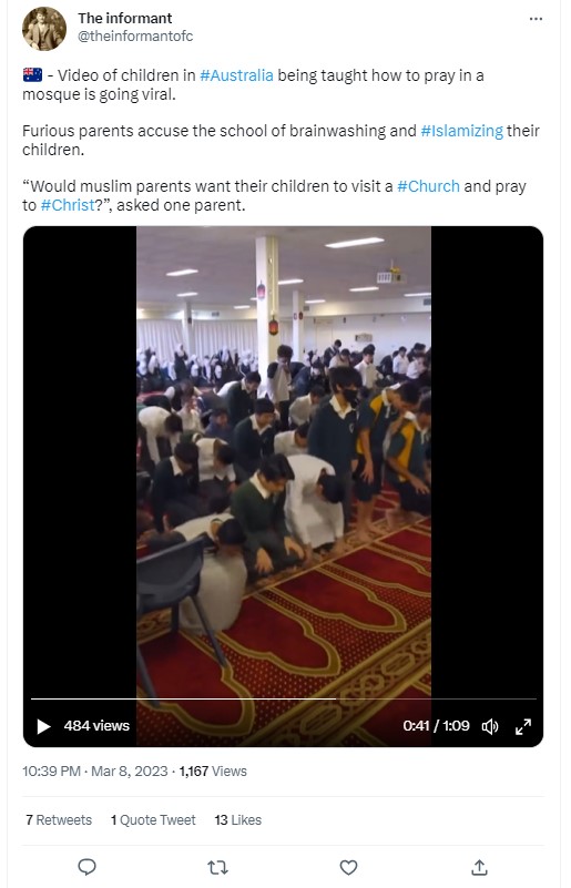A video purportedly showing non-Muslim students in an Australian school being taught how to pray in a mosque has created a stir on social media platforms. Those sharing the video allege that the “furious parents accuse the school of brainwashing and Islamizing their children in the name of pleasing a migrant community.” Newscheker found the claim to be untrue.