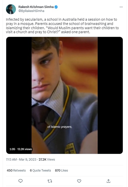 Twitter handle @MeghUpdates, who has been previously fact checked several times by Newschecker for sharing misinformation, was among those who shared the video, with the caption, “Australia: Parents go furious as a video of children in Australia being taught how to pray in a mosque goes viral. Furious parents accuse the school of brainwashing and Islamizing their children in the name of pleasing a migrant community.” Multiple other Twitter users shared the video with similar captions.