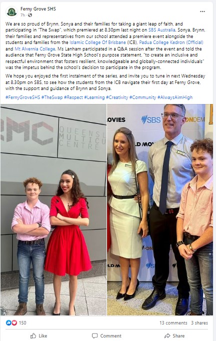 In a post dated March 9, 2023, Ferny Grove SHS stated, “We are so proud of Brynn, Sonya and their families for taking a giant leap of faith, and participating in “The Swap”, which premiered at 8.30pm last night on SBS Australia. Sonya, Brynn, their families and representatives from our school attended a premiere event alongside the students and families from the Islamic College Of Brisbane (ICB), Padua College Kedron (Official) and Mt Alvernia College…”