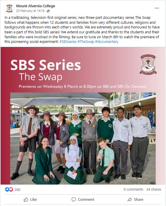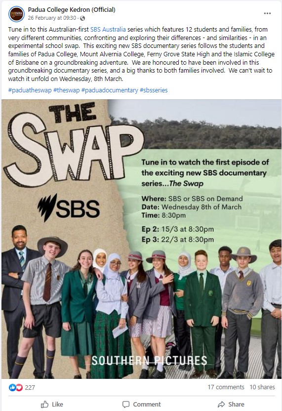 The Queensland Department of Education stated , “It’s here! #TheSwap premieres on SBS Australia this Wednesday night. Follow 12 students from Ferny Grove State High School, Padua College, Mount Alvernia College, and the Islamic College of Brisbane on their ground-breaking adventure as they confront and explore their differences – and similarities – in an experimental school swap…”