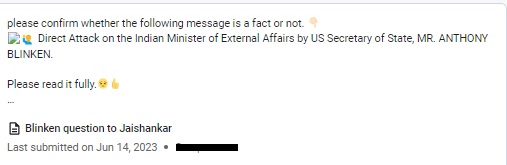 A purported public statement of US Secretary of State, Anthony Blinken, criticising India’s External Affairs minister S Jaishankar over the “persecution of Christians” in India, has been going viral on Whatsapp. We have received this forward on our Whatsapp tipline (9999499044), requesting it to be fact-checked.