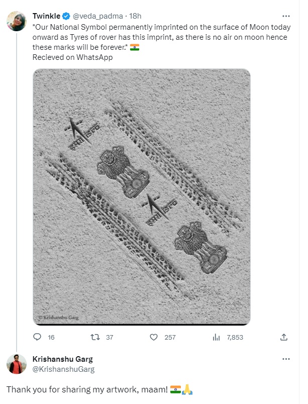 “Image permanently imprinted on the surface of Moon today onwards by the tyres of Rover. As there is no air on moon hence these marks will be there forever.”