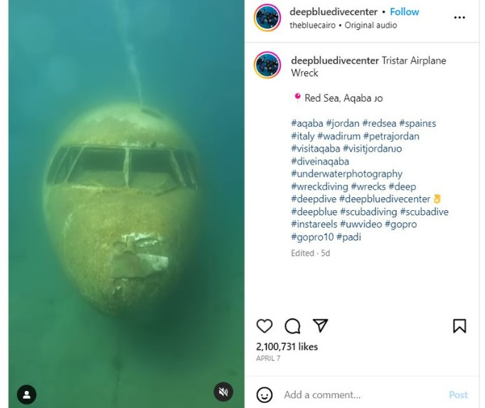 After comparing the initial few frames of the video titled ‘“Tristar Airplane Wreck📍Red Sea, Aqaba 🇯🇴,” with the viral image, we concluded the latter to be a screengrab from the clip posted by @deepbluedivecenter.