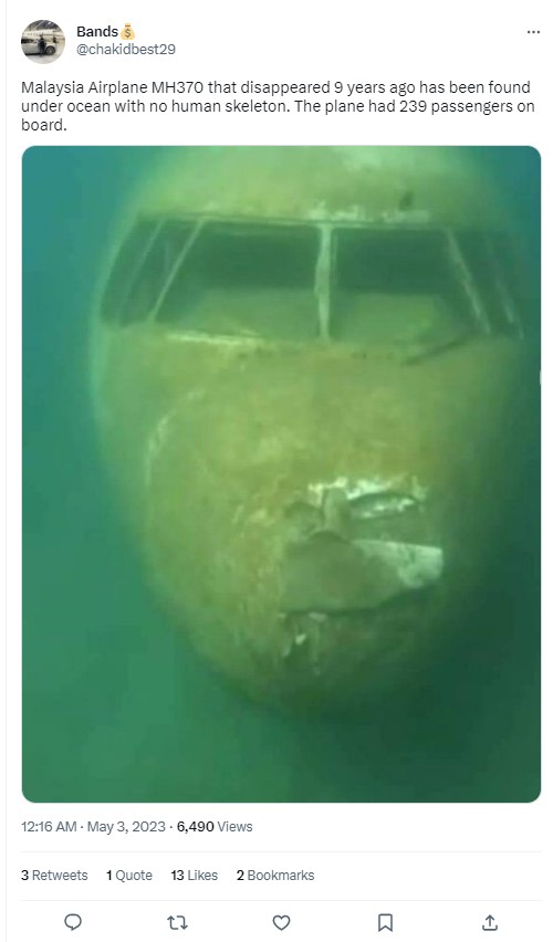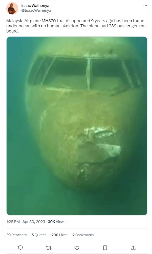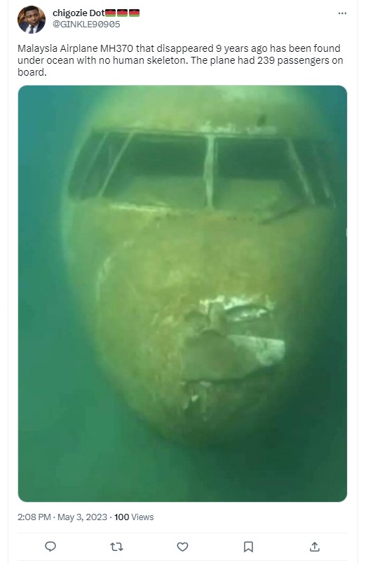 The image is being widely shared online with the caption, “Malaysia Airplane MH370 that disappeared 9 years ago has been found under the ocean with no human skeleton. The plane had 239 passengers on board.”
