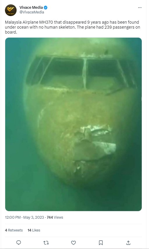 Viral post claiming that the Malaysia Airlines Flight MH370, which disappeared nine years back, was discovered under the ocean with no human skeletons is false.