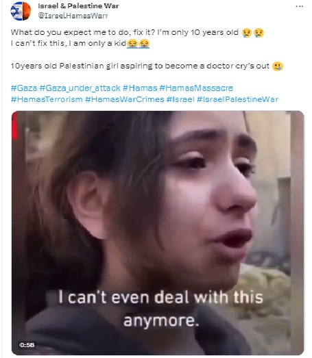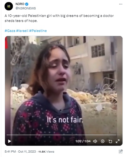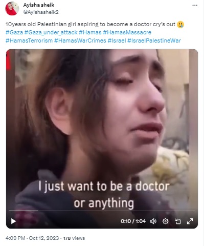 A 2021 video of a 10-year-old Palestinian girl breaking down falsely linked to 2023 Israel-Hamas conflict.
