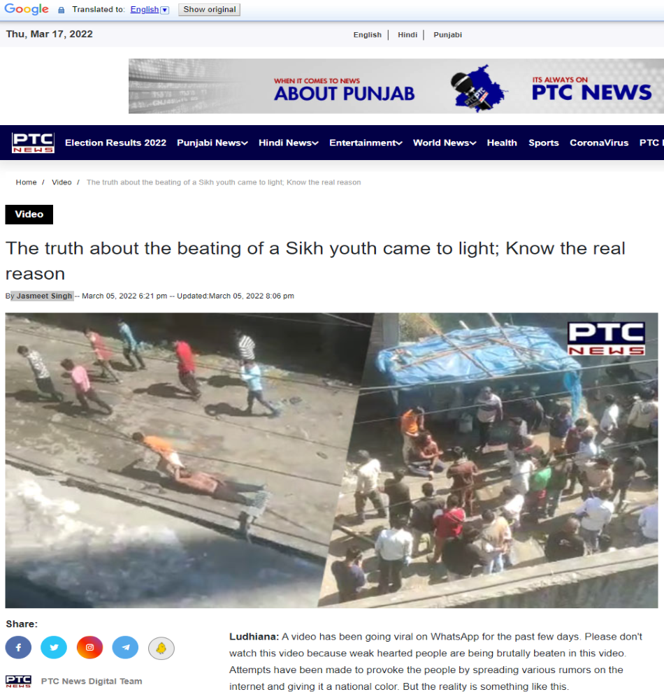 Upon performing a keyword search, Newschecker found a news report on YouTube shared by a YouTube channel named ‘The Aone Media’ uploaded on 7th March 2022. According to the report ,the video is from Tibba Road in Ludhiana, where a Sikh youth was badly beaten up by some local people.