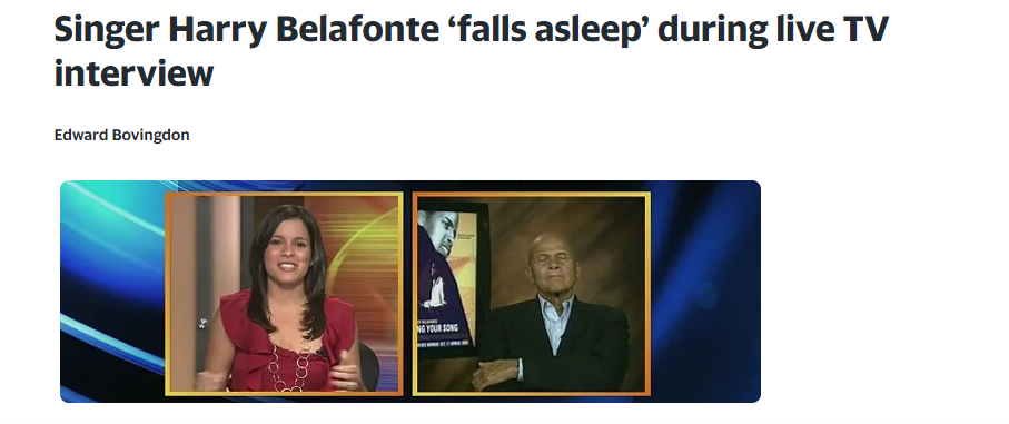 Detailing the incident, a Yahoo Entertainment article stated, “A video of Harry Belafonte seemingly falling asleep during a live TV interview with US show ‘Eyewitness News’ has gone viral across the web.The two minute clip shows the singer, most famed for his track ‘Banana Boat’, appearing on the show to promote his new book of memoirs. However, when the news anchor at KBAK video linked to him in New York, he appeared to be fast asleep and was unresponsive to the host’s desperate attempts to wake him.”