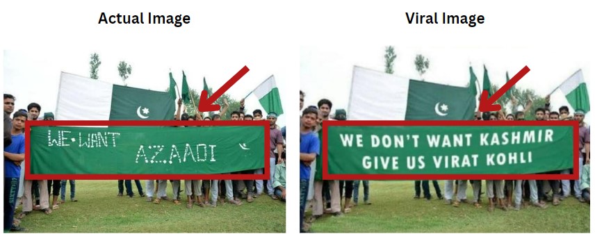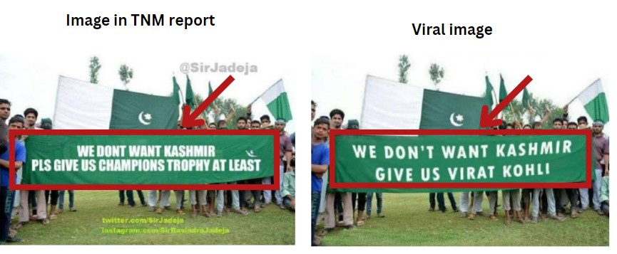 The report carried an image identical to the viral photograph. But the text on the banner, instead of the demand of Virat Kohli, read “WE DONT WANT KASHMIR PLS GIVE US CHAMPIONS TROPHY AT LEAST (sic)”.