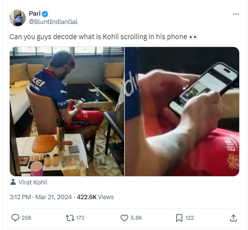 A Google lens search on the viral image led us to an X post by @BluntIndianGal, dated March 21, 2024. It carried a similar picture of Kohli on his phone with the caption, “Can you guys decode what is Kohli scrolling in his phone 👀.”