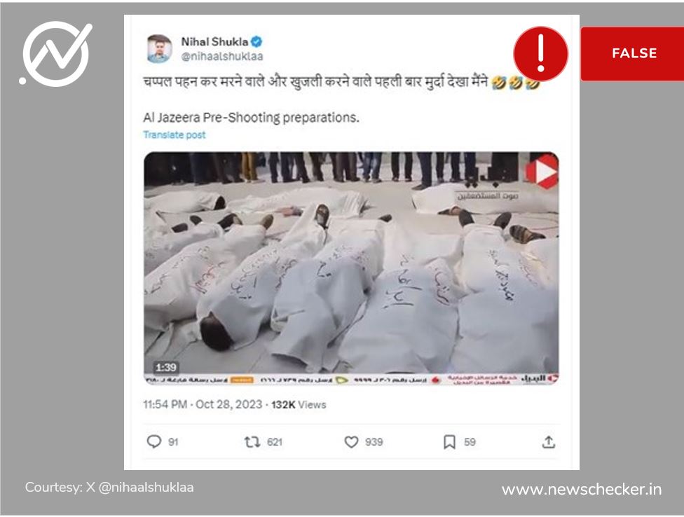 A 1.47-minute video is circulating on social media purportedly depicting dead bodies covered in white cloth. Users sharing the video allege that Palestinians in Gaza are staging deaths to gain international sympathy. The video seemingly shows moving bodies beneath the white sheets. Newschecker found that the video is 10 years old and shows a student protest in Egypt’s Al Azhar University.