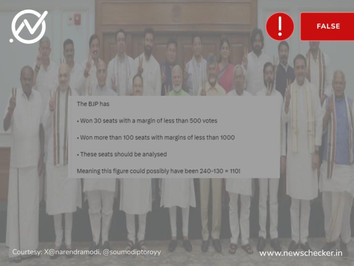 Several social media users claimed that the BJP won by a margin of less than 500 votes in 30 seats, and less than 1,000 votes in 100 constituencies in the 2024 Lok Sabha Polls. Newschecker found the viral claim to be fabricated as the lowest margin by which a BJP candidate won the Lok Sabha Poll was 1,587 votes.