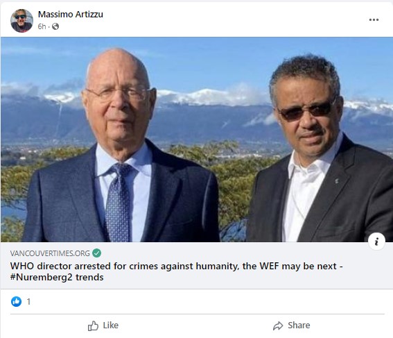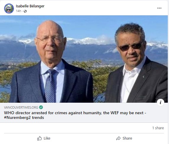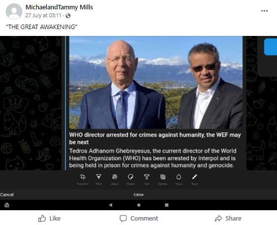 Multiple Facebook users shared a screenshot of a website, which stated that the WHO director-general was arrested for crimes against humanity. One user termed the alleged incident “the great awakening”.
