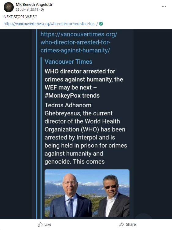 We noticed “Vancouver Times” written on the top of the viral images associated with the alleged arrest of the WHO director. Upon inspecting the link shared by social media users, claiming that Ghebreyesus was arrested for crimes against humanity, we were directed to an article by Vancouver Times, dated July 24, 2022.