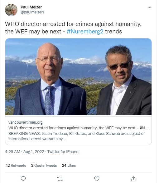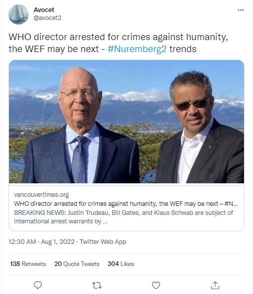 Titled “WHO director arrested for crimes against humanity, the WEF may be next – #Nuremberg2 trends”, the article elaborated about Ghebreyesus’s arrest over Covid-related issues. Notably, in the end note it read, “This is a satire article. Health officials consider COVID-19 vaccines to be safe and effective. For more information, please visit CDC.org.”