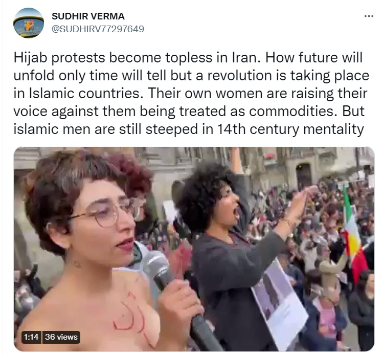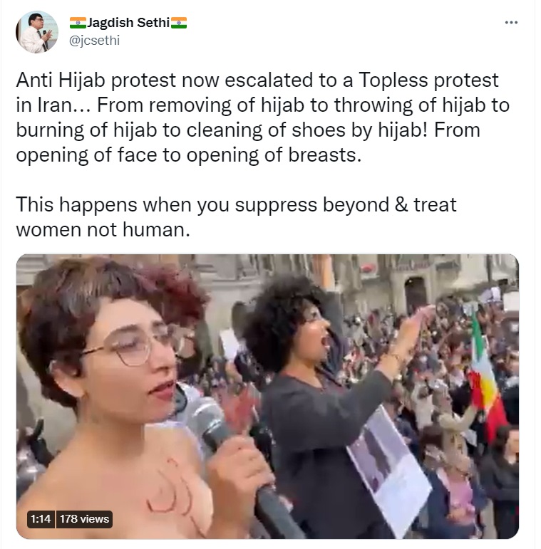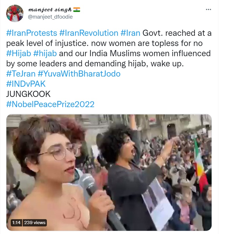 As protests against the Iran government’s hijab rules continue to rage, spilling over from Iran to several other parts of the world, social media users in India are sharing the video of a young woman protesting topless, addressing a crowd, purportedly in Iran.