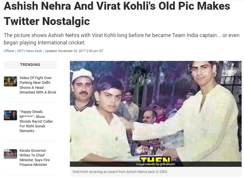 The report states many people on Twitter are sharing a photo of Ashish Nehra, who was returning from the 2003 World Cup, giving an award to a very young Virat Kohli.