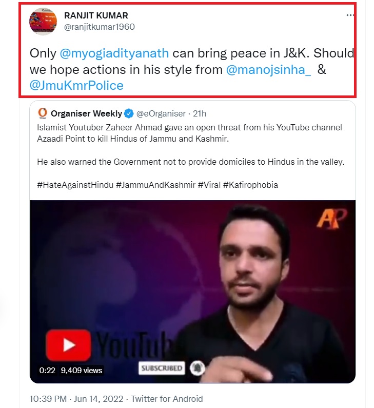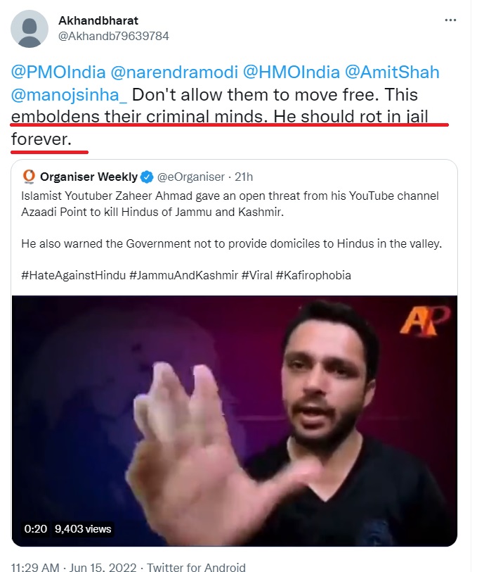YouTuber calling for the death of Hindus in Kashmir is based in PoK.